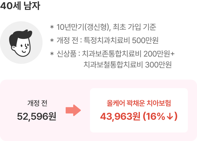 개정 전: 52,596원 개정 후: 올케어 꽉채운 치아보험 43,963원(16% 다운)