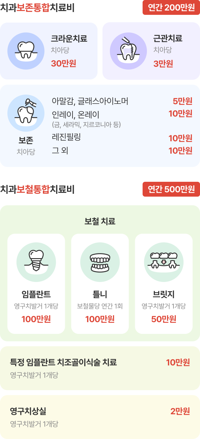 - 신상품:치과보존통합치료비 200만원+치과보철통합치료비 500만원